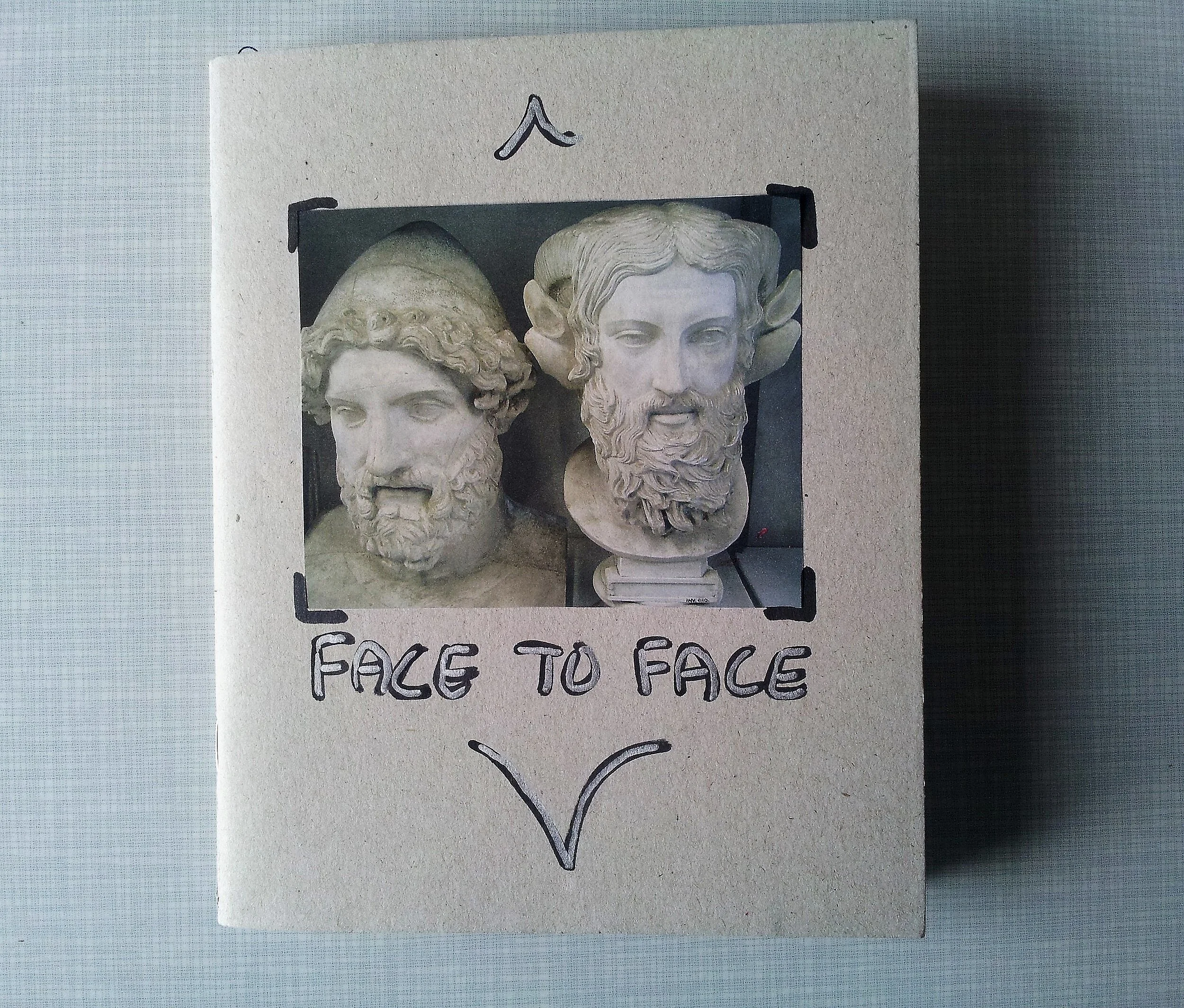 Artist book with collage series of faces from antiquity symbolically connected by sewing thread and ribbon.