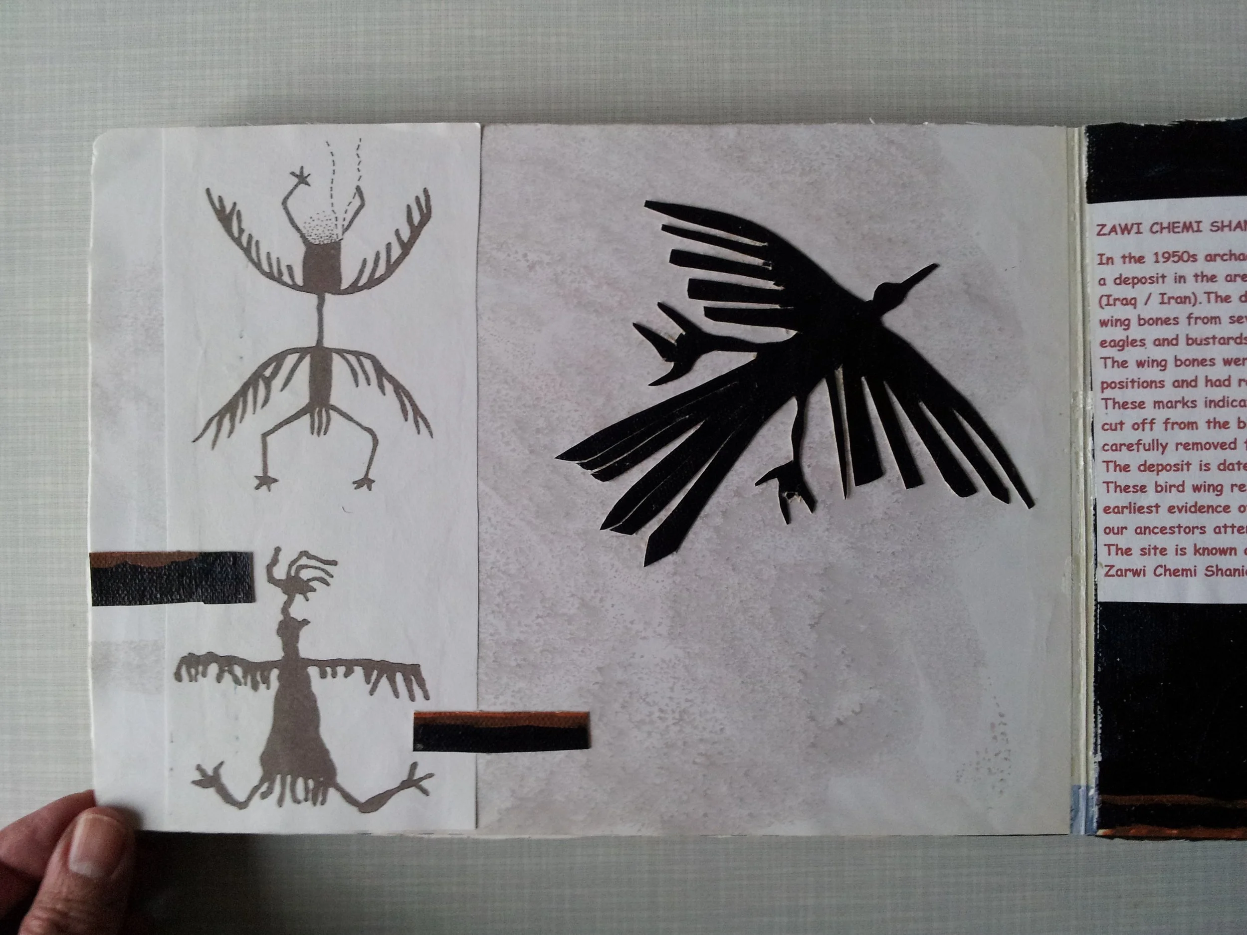 In the 1950s archaeologists discovered a deposit in the area of the Zagros Mountains. The deposit contained buried wing bones from several large birds - vultures, eagles and bustards. The wing bones were buried in correct anatomical positions and had remains of certain slice marks. These marks indicate that the wings had been carefully cut off from the birds and that the feathers were carefully removed from the wings. The deposit is dated to around 10,000 years ago and are probably one of the earliest evidence of shaman-like rituals and our ancestor’s attempt to fly like birds. The site is known among archaeologist as: Zawi Chemi Shanidar. (From my paper: Human interactions with animals at Zawi Chemi Shanidar, University of Copenhagen). My study inspired me to make the artist book PRIMARY FLIGHT FEATHERS. See below.